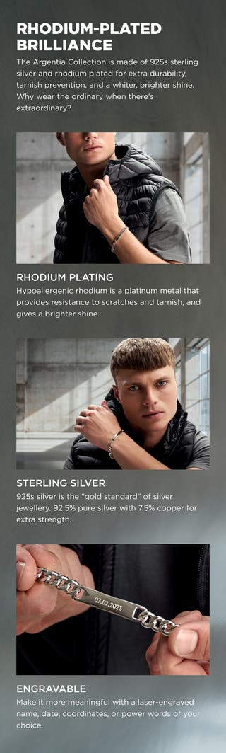 When worn, the polished silver plate and linked chain create a balanced profile that suits both casual and smarter shirts. The low-profile plate layers neatly with other bracelets or a watch without catching on cuffs. The nickel-free silver is gentle on the skin for regular use.