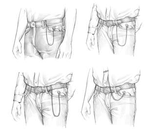 The chain can hang on the outside of the belt or loop from underneath the belt. We suggest using the pocket opposite your dominant hand to make checking the time easier.