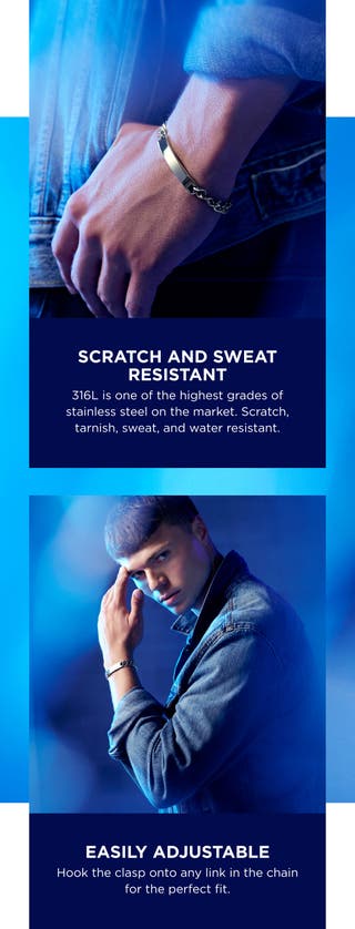 This bracelet is made from 316L stainless steel, with a polished curb chain and a flat ID plate for a clean, modern look. The links have a smooth finish for a low-profile shine, and the metal is nickel-free to reduce the risk of skin irritation. The result is a simple, refined piece that feels durable and understated.