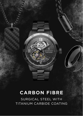 Surgical-grade stainless steel and genuine leather with carbon fibre highlights. The steel is titanium carbide coated.